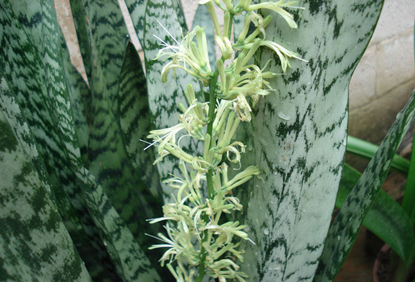 葉簇生,劍葉剛直立,葉全緣,表面乳白、淡黃、深綠相間,呈橫帶斑紋。常見的家庭盆栽品種,耐干旱,喜陽(yáng)光溫暖,也耐陰,忌水澇??晌帐覂?nèi)80%以上的有害氣體,吸收甲醛的能力超強(qiáng)。