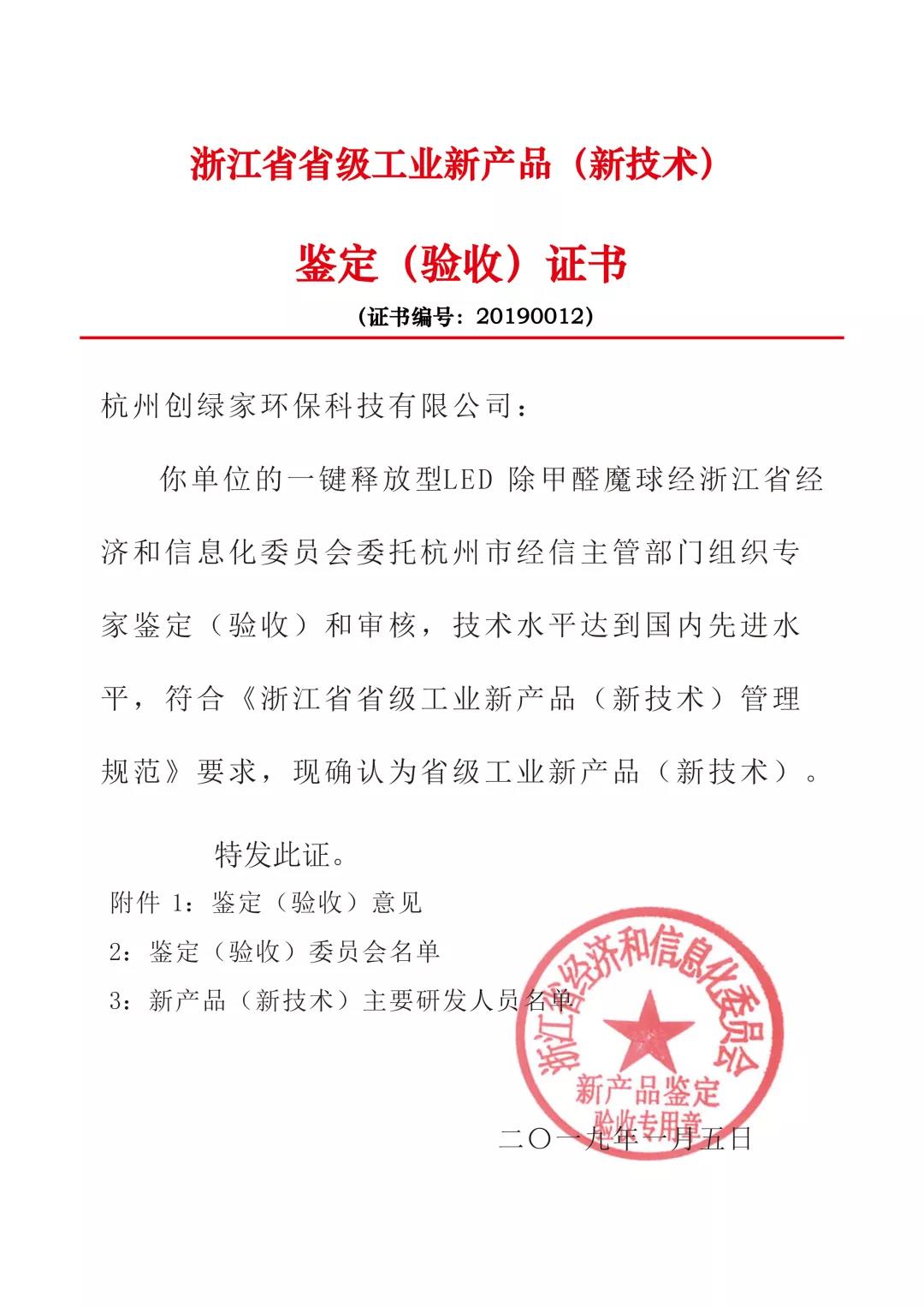 創(chuàng)綠家環(huán)保旗下明星產(chǎn)品搖一搖除甲醛魔球經(jīng)浙江省經(jīng)濟(jì)和信息化委員會(huì)委托杭州市經(jīng)信主管部門組織專家鑒定(驗(yàn)收)和審核,技術(shù)水平達(dá)到國(guó)內(nèi)先進(jìn)水平,符合《浙江省省級(jí)工業(yè)新產(chǎn)品(新技術(shù))管理規(guī)范》要求,現(xiàn)確認(rèn)為省級(jí)工業(yè)新產(chǎn)品(新技術(shù))。