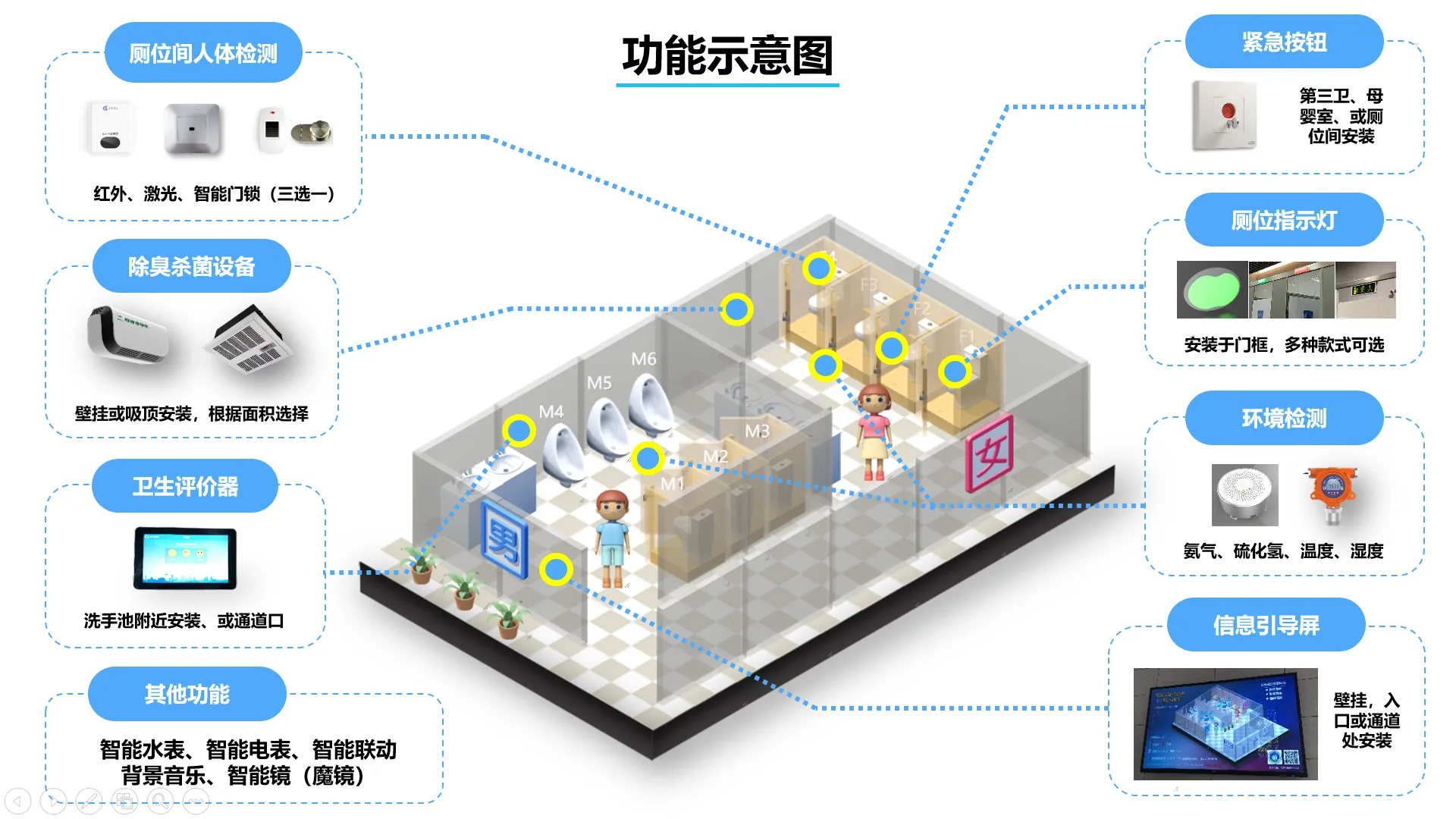智慧廁所旨在提升公共衛(wèi)生設(shè)施的品質(zhì)和服務(wù)水平,為大眾提供更加便捷、舒適和環(huán)保的廁所體驗(yàn)。如今,隨著科技的不斷進(jìn)步,智慧廁所系統(tǒng)被廣泛采用和建設(shè),其功能和特點(diǎn)也越來(lái)越豐富多樣。下面將介紹智慧廁所系統(tǒng)的內(nèi)容。