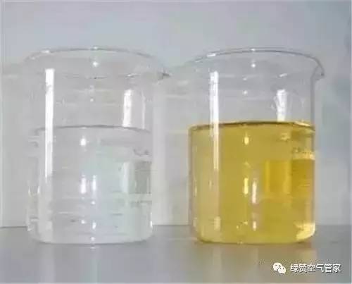 左邊為純凈水、右邊為自來水,可以明顯看到純凈水沒有變色,證明沒有余氯殘留。而自來水有明顯的變成黃色,證明有一定程度的余氯殘留。